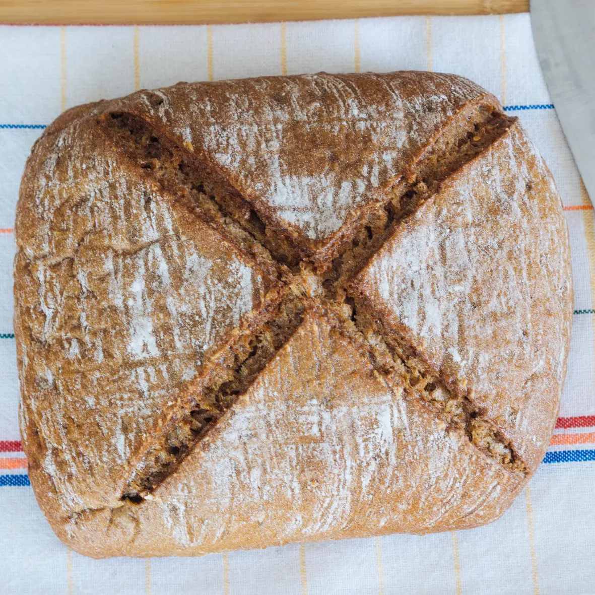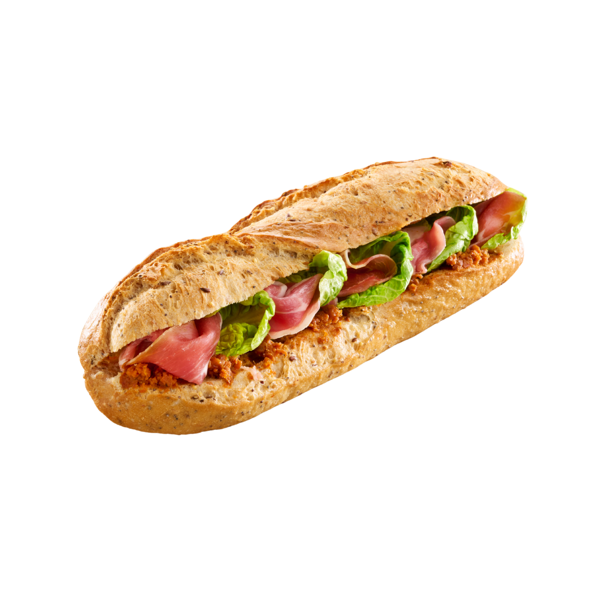 Focaccia moelleux, pesto basilic, jambon sec, tomates, roquette.