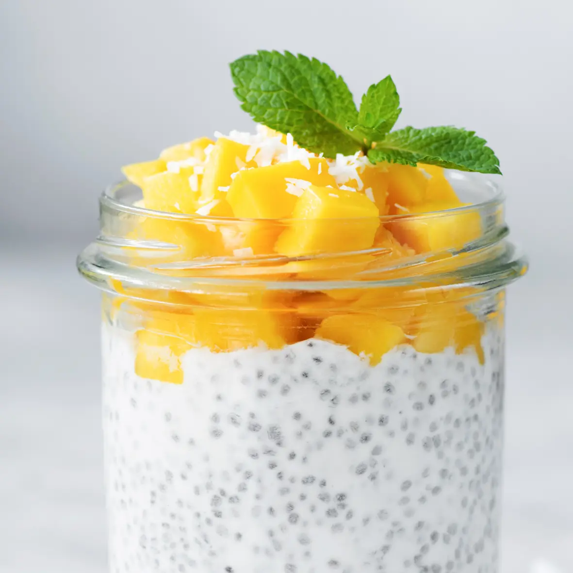 Graines de chia, lait de coco, sucre de canne, purée de mangue et purée de fruits de la passion