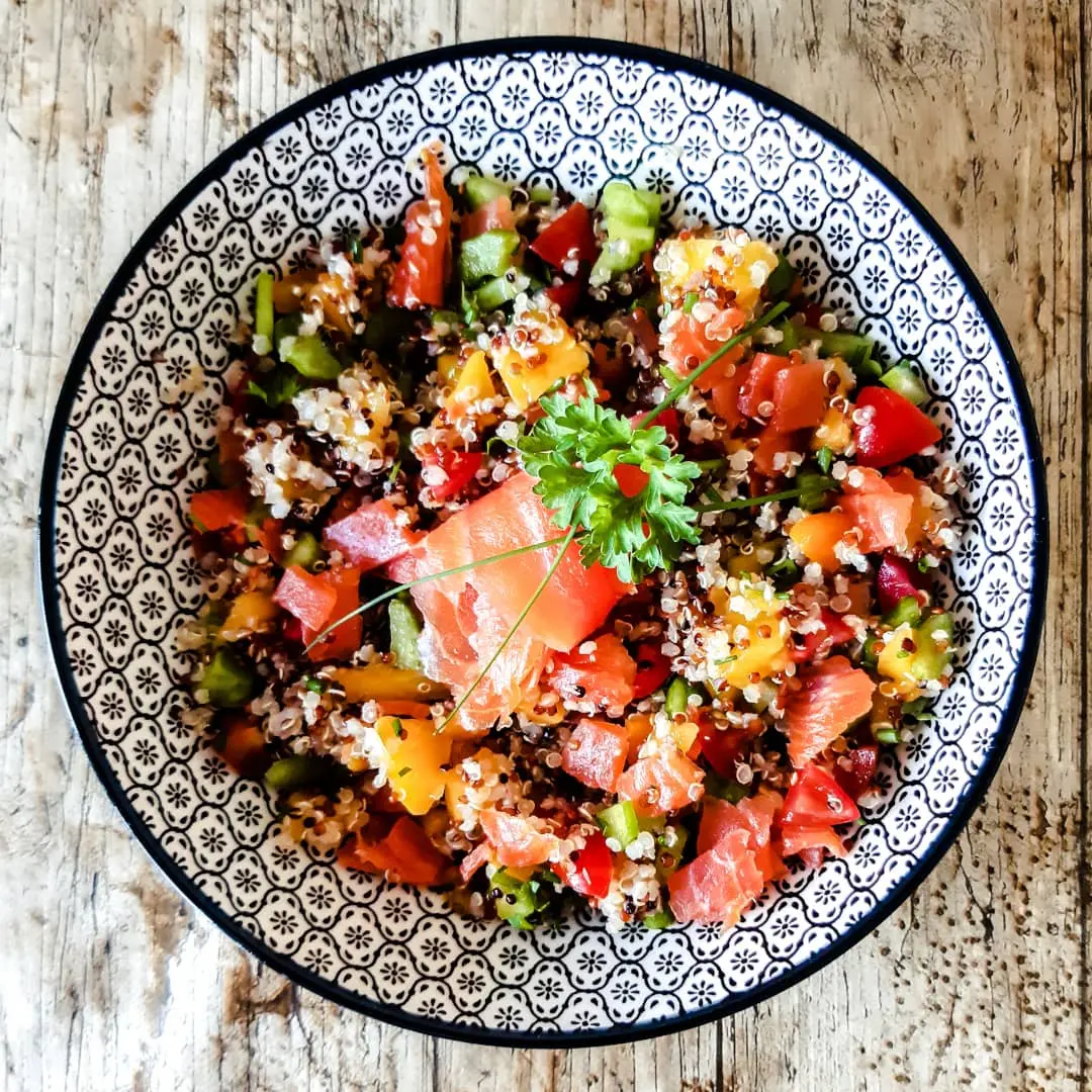 Quinoa, oignon rouge, betterave, feta, pomme, carotte, salade verte, poulet, œuf