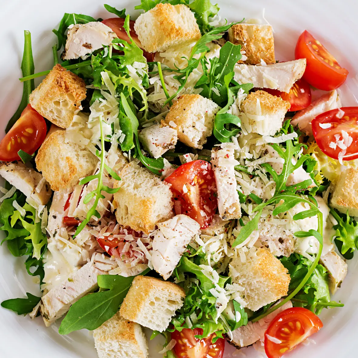 Salade, œuf, tomates cerises, tomates séchées, croûtons, poulet, parmesan