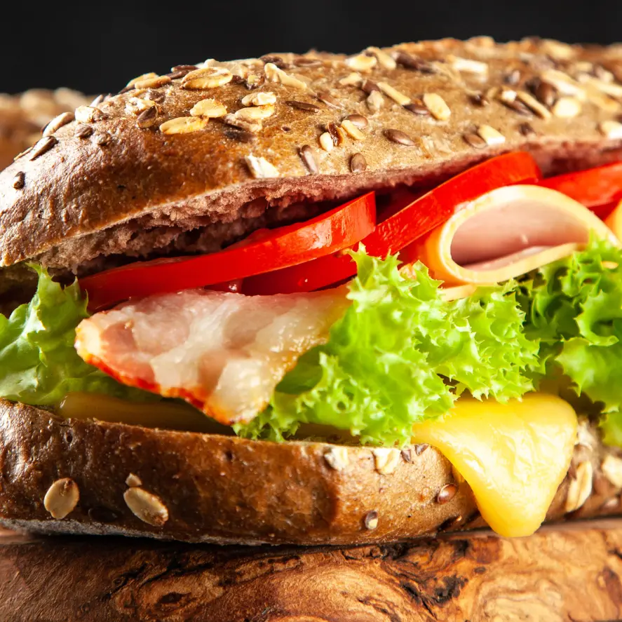 Pain baguette, poulet grillé, bacon croustillant, emmental, laitue, tomates, mayonnaise, et moutarde