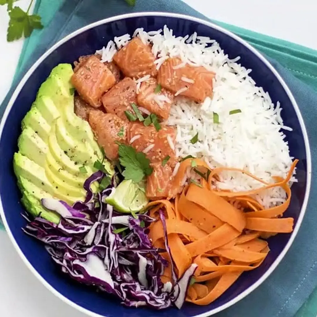 Riz vinaigré, saumon gravlax , salade, carottes, chou, fèves, concombre.