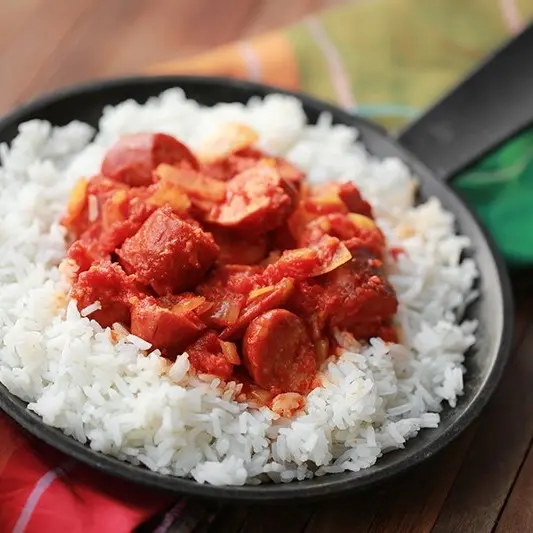Riz, saucisses fumées, tomates, oignons, ail, gingembre, piments, curcuma, thym, huile, sel, poivre.