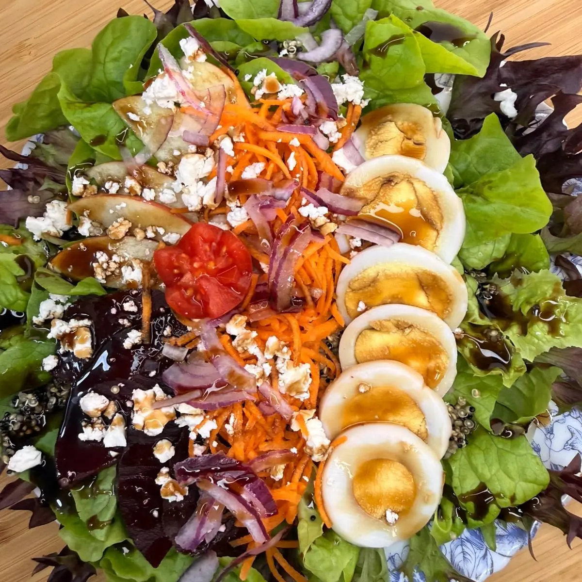 Quinoa, oignon rouge, betterave, feta, pomme, carotte, salade verte, œuf.