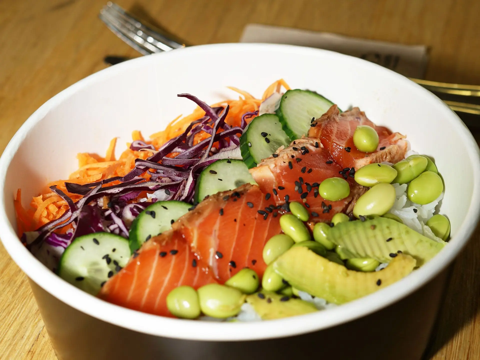 Ingrédients : riz vinaigré, saumon snacké façon tataki, légumes croquants (carotte, concombre, chou…), assaisonnement léger.