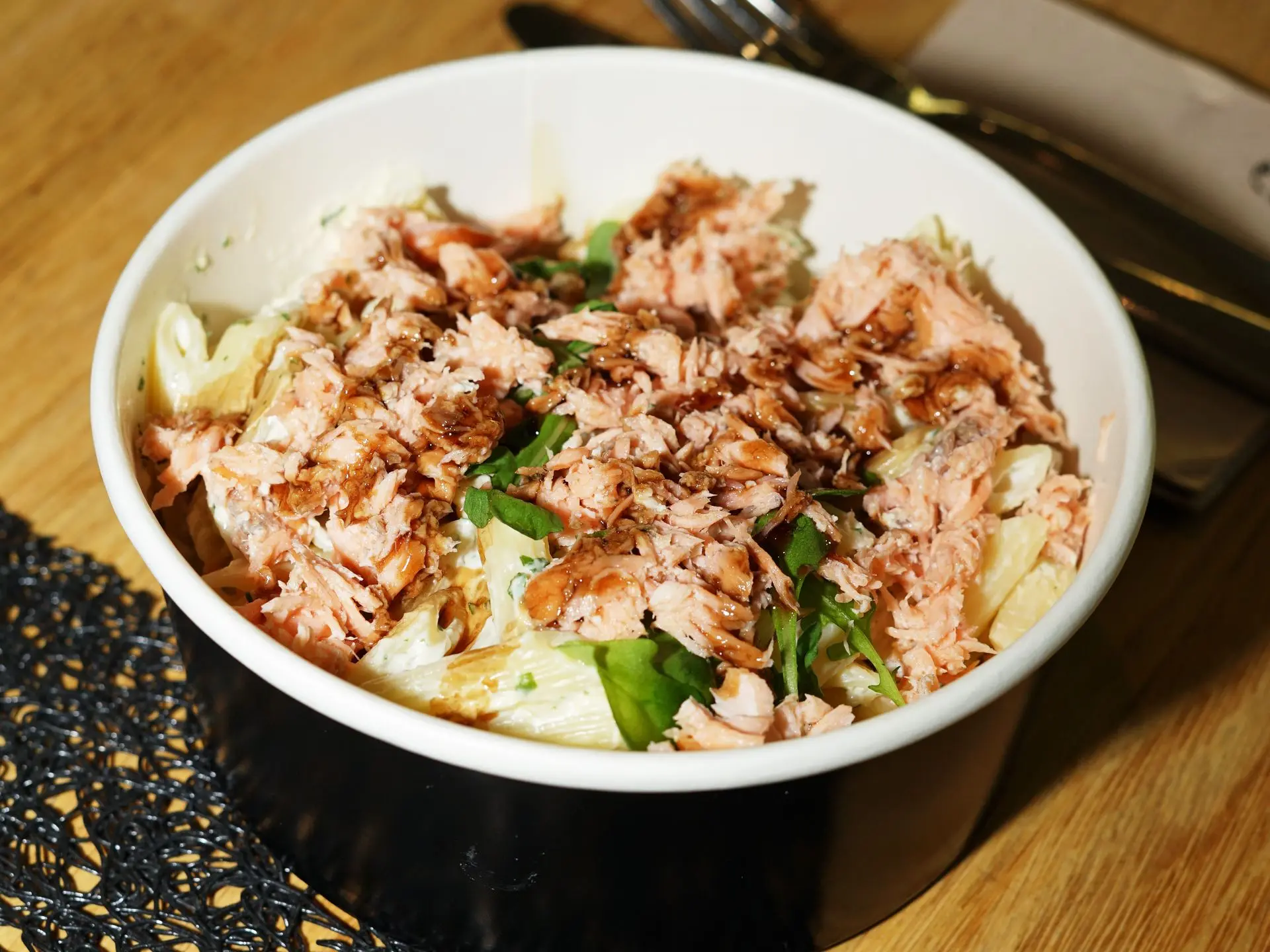 Ingrédients : pâtes, saumon fumé, sauce ail & fines herbes, roquette.