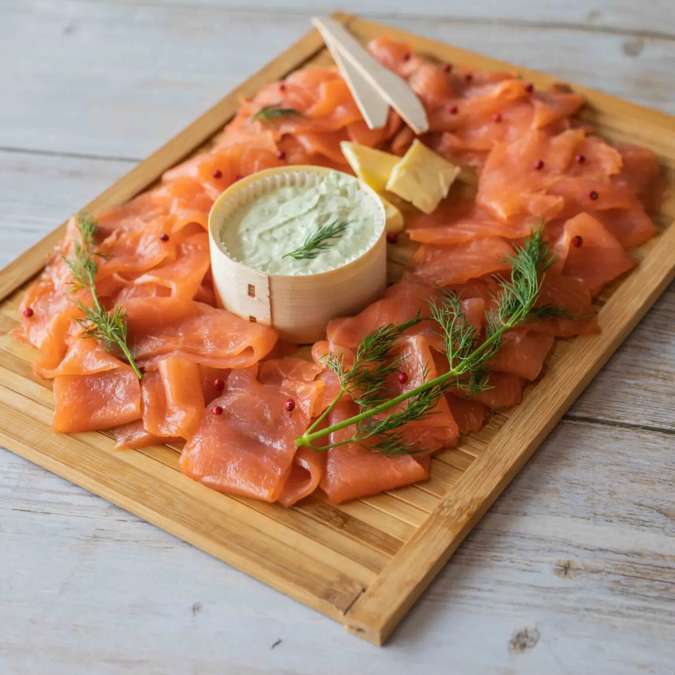 Saumon fumé, sauce blanche, concombre & pousses d’épinards