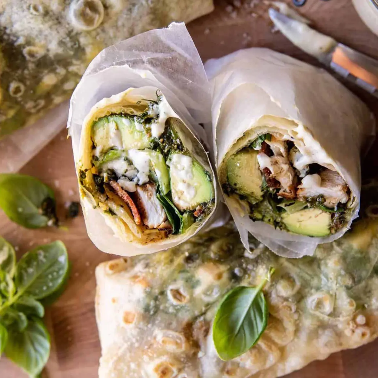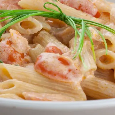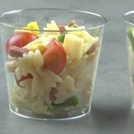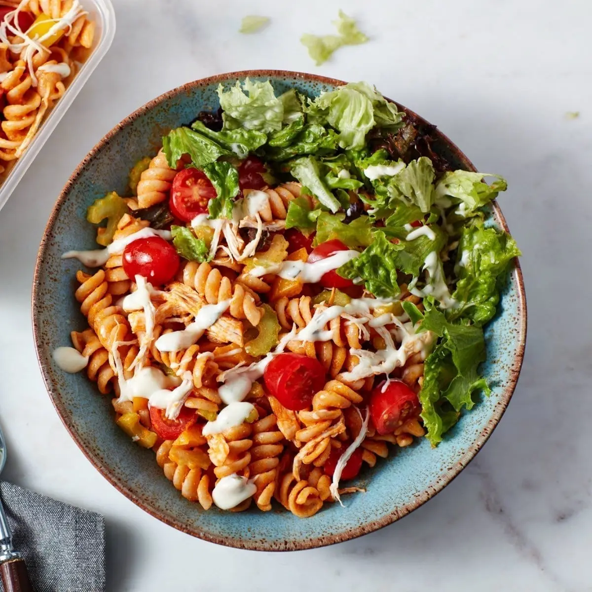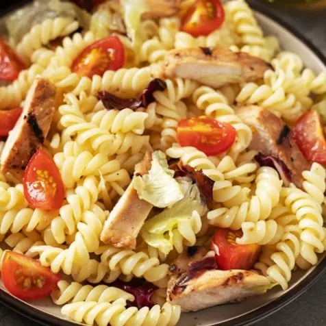 Pennes, pesto, poulet, tomates cerises séchées, billes de mozzarella
