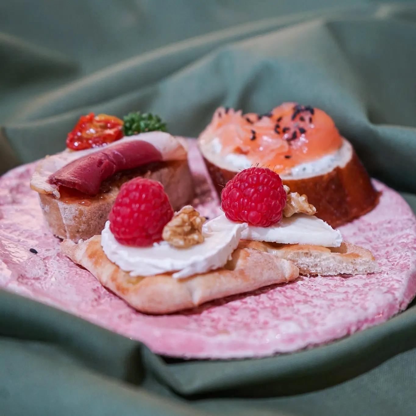 Toasts tataki de saumon, cabécou au miel, pesto & magret