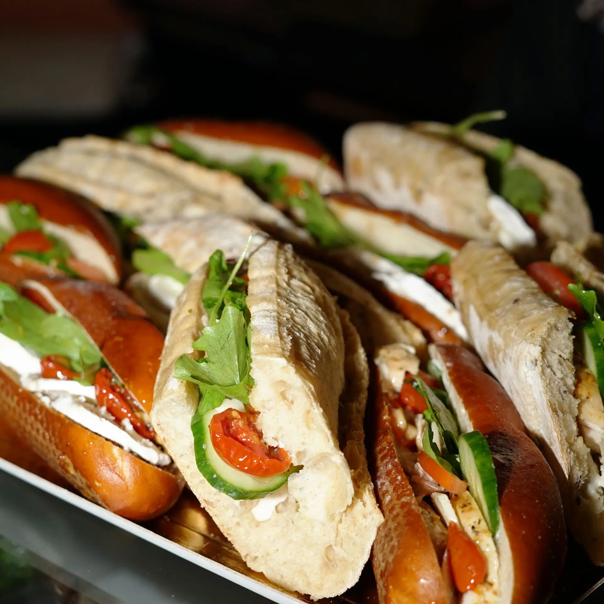 Mini pains briochés, viande hachée, fromage fondu, laitue, tomates, cornichons